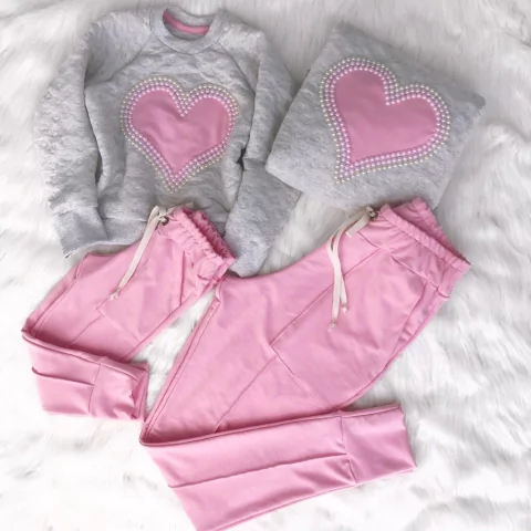 - > Conjunto moletinho Cinza coração rosa e calça rosa mãe e filha