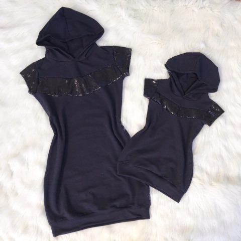 Vestido preto paetê e touca mãe e filha