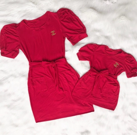 - > Vestido vermelho manga bufante simbolo mãe e filha